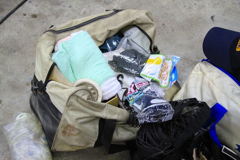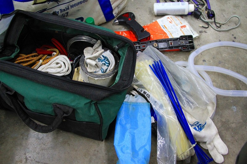 針金類、ゴムひも類、タイラップ類、ハンマーに三角表示板に、簡易キャメルバック、