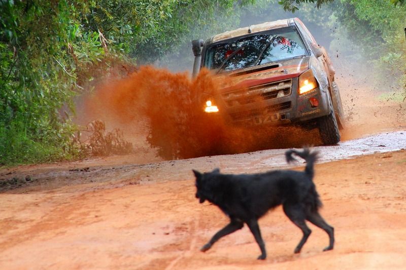 そして、なぜか競技車両の前に飛び出してくるんです!